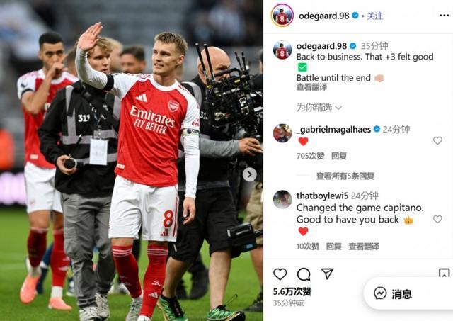 2-1绝杀逆转纽卡,赛后,厄德高更新了社交媒体。厄德高写道:“回到胜轨。这3分拿的感觉真棒,战斗到底。”独家看