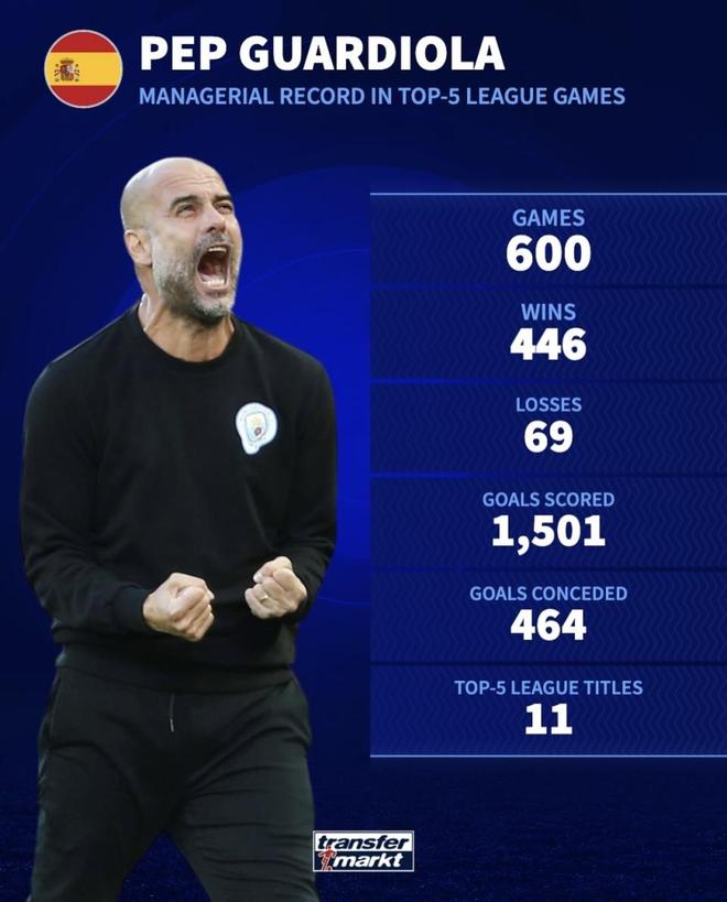 瓜迪奥拉五大联赛执教成绩场次:600胜场:446负场:69进球:1,501失球:464五大联赛冠军:11