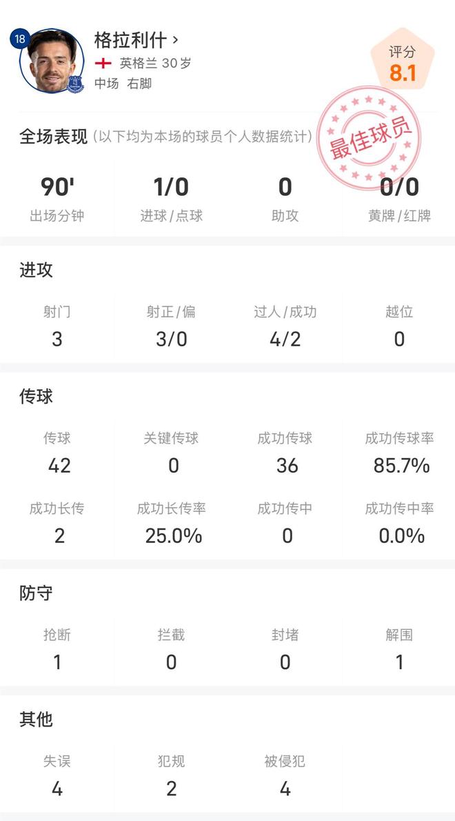 联赛第7轮比赛,凭借着格拉利什第93分钟的绝杀进球,埃弗顿主场2-1逆转水晶宫,送给对手赛季首败。此役,埃弗顿攻击手格拉利什首发并踢满全场,在第93分钟攻入绝杀进球,3次射门全部射正,4次尝试过人两次成功,42次传球,成功率85.7%,防守端贡献1次抢断和1次解围,还有4次被对手侵犯,赛后机器评分8.1分。赛后