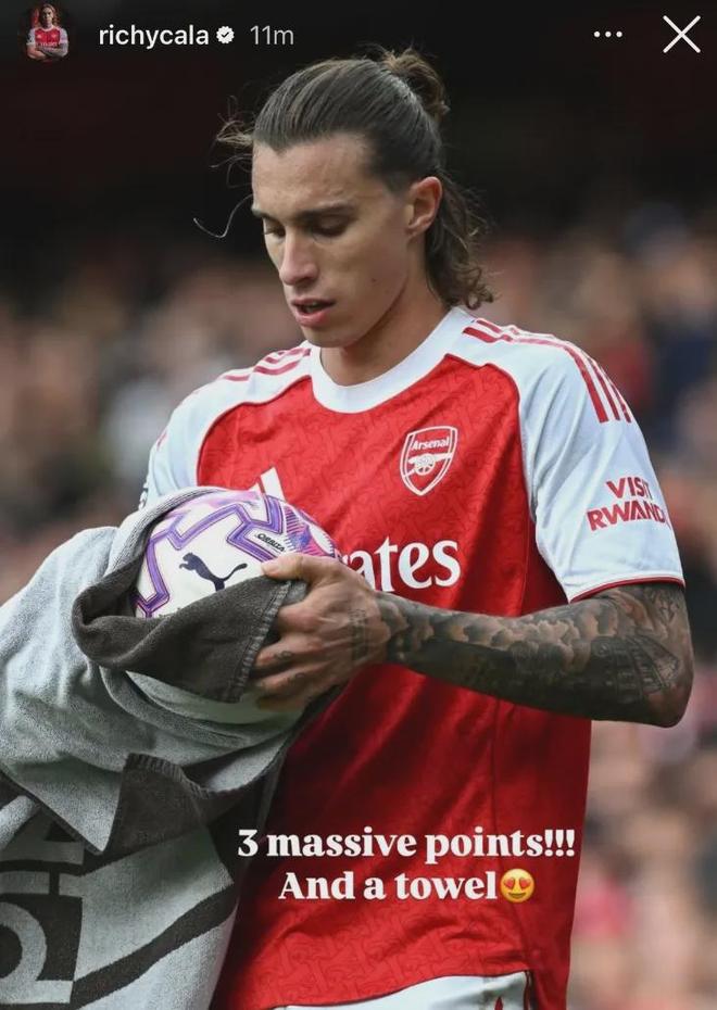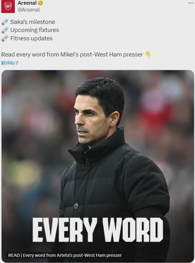 本场比赛是阿尔特塔执教阿森纳的第300场比赛,战绩为:181胜51平68负,场均1.98分。在英格兰执教的前300场比赛,只有瓜迪奥拉、穆里尼奥和达格利什胜场更多,你说克伦克会解雇他吗?哪怕暂时没有冠军……塔子这个赛季其实是进步了,首发敢轮换(关键是也有人轮换),调整换人也比较主动,本赛季夺冠真的大有希望!从落后5分到领先1分,才用了2轮,我其实一直坚信阿森纳的阵容厚度早晚也能建立优势登顶,但没想到这么快……简单说说比赛吧:波澜不惊主场顺利拿下西汉姆,没有重蹈最近几个赛季主场面对铁锤时有翻车的覆辙,这样#阿森纳#顺利冲到了榜首!我只看了下半场,根据球迷们的点评,看起来上半场也是碾压局,完全有可能比分更大的,结合后45分钟的话,本场可以说西汉姆毫无还手之力,阿森纳的胜利是实力的体现。而且阿尔特塔轮换是越发玩的得心应手,居然首发就轮换了赛季开始以来连续作战的祖比门迪,派出了进攻属性很强的三中场,当然厄德高受伤下场那是意料之外,但只要阿尔特塔坚持这种用兵和心态,冠军才真正有希望。美中不中是下半场赖斯换晚了,其实没必要让他再坚持的……希望没事吧。今天两个进球都是右路发起的进攻造成的,但下半场其实左路更活跃,依靠特罗萨德传对方后卫身后插上的队友就制造了很多机会,这显然是演练过的,运气好可能赖斯就助攻哲凯赖什了。赖斯确实高级,祖比门迪也踢得很好(参与了进球,其实防守他也参与度很高的),埃泽还未完全融入但已经能看出“高级”,总之今天全队发挥不错,赢得轻松。感觉努诺还是研究过阿森纳的角球战术的,但毕竟双方实力差距太大,他刚上任,这个团队还没捏合成型,没有给阿森纳造成实质性威胁(起码下半场是这样)。下半场落后情况下西汉姆并没有加快节奏发力反扑,不想也好,没能力也好,总之这种战术阿森纳也很难踢出大比分,今天这可以了。点球这个可能反而是最不该给的,但该给的反倒没给,你永远弄不明白英超裁判……恩瓦内里和斯凯利也得到了替补机会,以一场胜利迎接国际比赛日再好不过,但厄德高再次受伤令人惋惜,赖斯似乎问题不大。Opta统计,对西汉姆的点射是萨卡在英超直接参与的第100粒进球(55球45助攻),而他也凭借24岁29天的年纪成为了英超历史上参与100球第7年轻的球员,也是卢卡库(2017年2月,当时23岁267天)之后解锁这一成就最年轻的球员。此外这场比赛也是萨卡出战的第200场英超比赛。第200场英超比赛,参与100球,相当高的效率了。而且不要忘了,萨卡刚出道时有段时间并非主力,甚至并非是锋线球员,他开始还踢了很长时间的边翼卫,而且从左边换到了右边,实际上萨卡的稳定高效比数据体现的更直观。宝藏男孩就是宝藏男孩,就等续约了。率领阿森纳夺冠走向巅峰,作为传奇终老吧!Squawka统计,廷贝尔在对西汉姆的比赛中8次对抗成功,6次完成铲断,两项数据均是全队第一。廷贝尔是不是英超最被低估的球员不好说,但他绝对是顶级球员,他从上赛季以来出色的表现让人迅速遗忘了怀特的重要性,现在廷贝尔早就在右路和萨卡等人建立了默契,防守非常稳健,前场进攻非常犀利。这场比赛萨卡的进球又是廷贝尔积极的前插导致的,当然,其实这个点球的判罚我觉得值得商榷,但裁判这次反而没看VAR,该给的不给,有争议的倒是给了,英超裁判……阿森纳只要拿下冠军,这条后卫线我感觉甚至每个人都有资格竞争自己位置上的世一卫……官方:赖斯被阿森纳官方票选为了全场比赛最佳球员。赖斯本赛季初有点疲态,而且中场重组之后有那么几场比赛感觉他不太适应自己的新角色,但最近几场,球迷熟悉的那个赖斯又回来了,前插有进球和助攻,后撤能破坏对手单刀!自加盟之后,我就没见过赖斯有哪段时间低迷的,他几乎始终状态在线!这样的球员,就是1亿的标杆,又职业又帅又能打!买到就是赚到!其实本场比赛我觉得祖比门迪也能竞争最佳,祖比上场之后连续制造机会,据说贡献了12次直塞,而且两个进球都来自他的直接策动,战术价值一览无遗!对祖比还是要客观包容些,有时候可能他会隐身,有时候防守时他可能吃力些,带球推进过人的场面也少,但这不影响他的长处,他绝对是个顶级中场,而且是少见的中场指挥官,这样的中场已经很难买到了,珍惜吧!卡拉菲奥里IG:重要的三份!还有一条毛巾!拉菲这个赛季是既能打出勤又稳定,而且还挺幽默……上场对纽卡斯尔时,他“偷了”波普的毛巾,裁判禁止,这回在主场没人管了吧……上赛季的拉菲让人质疑这笔签约,感觉是买了个模特、签了个寂寞,但这个赛季拉菲证明他确实值这个价!继续保持健康!晚旗报记者SC消息,尽管疑似背部受伤,但赖斯预计将前往英格兰报到,备战接下来的比赛。赖斯在比赛中主动要求下场,让人捏一把汗,说实话他是这个阵中唯一没有真正替代者的人,但好在看来问题不大……其实阿尔特塔这场比赛啥都好,就是对厄德高和赖斯还是换人不及时,这个毛病要改的,球员一旦出现受伤迹象,就别让他们再坚持了,尤其是赖斯,其实被换下前就已经示意换下了,结果塔子还是让他踢了会……没事就好。但厄德高就没有那么幸运了……Opta统计,厄德高成为了英超历史上第一位连续3场英超比赛首发出场但却在半场之前被替换下场的球员……尴尬的数据,但这并不怪厄德高,小队长最近甚至有明显的状态复苏,甚至让人看到了巅峰时