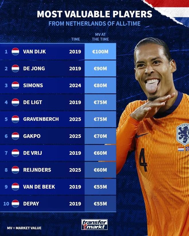 德转列荷兰球员历史身价榜:范戴克第1,德容、德利赫特在列