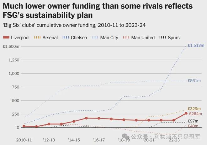 图表:远低于部分竞争对手的所有者注资反映了 FSG 的可持续计划。自 FSG 在 2010-11 赛季初收购利物浦以来,'Big Six' 俱乐部所有者注资的折线图,其中利物浦的 2.64 亿英镑低于其他三家,并显著低于切尔西和曼城。注:所有者注资包括以股权或贷款形式注入的现金,减去任何贷款偿还、支付的股息或其他提取性措施(例如股票回购)。利物浦所面临的——托特纳姆热刺也处于类似境地——是那些拥有更多现金储备可调用的俱乐部。在另一个时代,克洛普可能已经赢得了五次