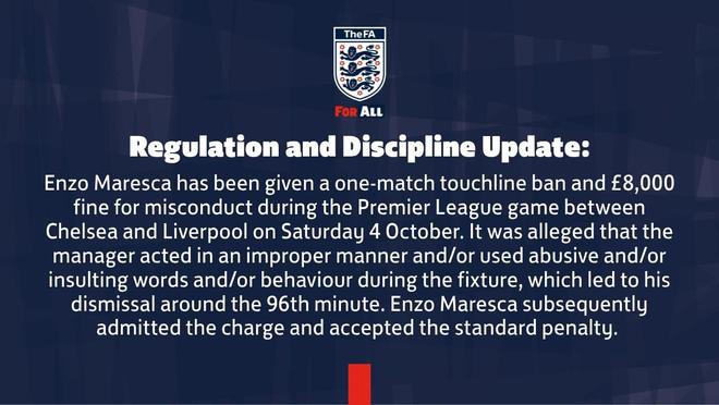 北京时间10月15日,英足总官方发布公告,公布了对马雷斯卡的处罚措施,后者在对阵利物浦的比赛中被红牌罚出场外。
