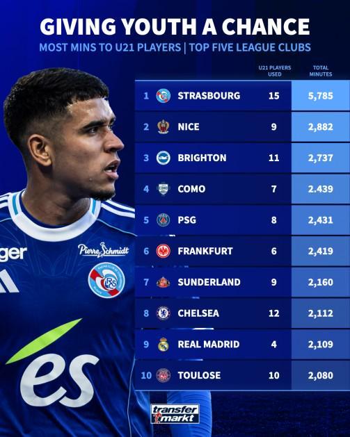 北京时间10月16日,德转统计出了本赛季至今欧洲五大联赛俱乐部U21球员的出场时间排行榜,斯特拉斯堡15名球员共计出场5785分钟高居第一,巴黎圣日耳曼、切尔西以及皇家马德里也都进入前10位。五大联赛俱乐部本赛季U21球员出场时间排行榜:1. 斯特拉斯堡 15人 5785分钟2. 尼斯 9人 2882分钟3. 布莱顿 11人 2737分钟4. 科莫 7人 2439分钟5. 巴黎圣日耳曼 8人 2431分钟6. 法兰克福 6人 2419分钟7. 桑德兰 9人 2160分钟8. 切尔西 11人 2112分钟9. 皇家马德里 4人 2109分钟10. 图卢兹 10人 2080分钟【上咪咕独家看英超