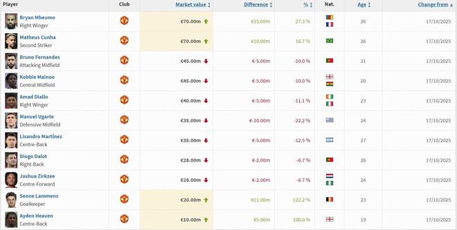 曼联球员身价变动(单位:欧元)姆伯莫,上涨1500万,现身价7000万马特乌斯-库尼亚,上涨1000万,现身价7000万布鲁诺-费尔南德斯,下跌500万,现身价4500万梅努,下跌500万,现身价4500万阿马德-迪亚洛,下跌500万,现身价4000万乌加特,下跌1000万,现身价3500万利桑德罗-马丁内斯,下跌500万,现身价3500万达洛特,下跌200万,现身价2800万齐尔克泽,下跌200万,现身价2800万拉门斯,上涨1100万,现身价2000万艾登-海文,上涨500万,现身价1000万(注:榜单中未列及的球员维持原身价,本期身价没有更新)【上咪咕独家看
