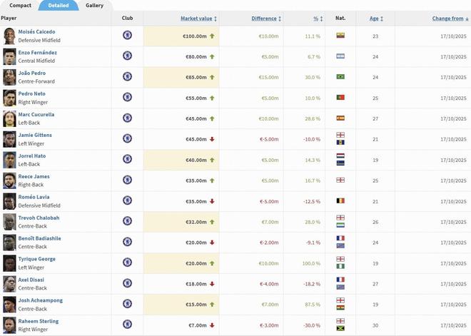 莫伊塞斯-凯塞多,上涨1000万欧,现身价1亿欧恩佐-费尔南德斯,上涨500万欧,现身价8000万欧若昂-佩德罗,上涨1500万欧,现身价6500万欧佩德罗-内托,上涨500万欧,现身价5500万欧库库雷利亚,上涨1000万欧,现身价4500万欧比诺埃-吉滕斯,下跌500万欧,现身价4500万欧哈托,上涨500万欧,现身价4000万欧里斯-詹姆斯,上涨500万欧,现身价3500万欧拉维亚,下跌500万欧,现身价3500万欧特雷沃-查洛巴,上涨700万欧,现身价3200万欧巴迪亚西勒,下跌200万欧,现身价2000万欧泰里克-乔治,上涨1000万欧,现身价2000万欧迪萨西,下跌400万欧,现身价1800万欧乔希-阿昌庞,上涨700万欧,现身价1500万欧斯特林,下跌300万欧,现身价700万欧(注:榜单中未列及的球员维持原身价,本期身价没有更新)【上咪咕独家看