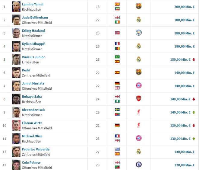 球员身价,切尔西后腰凯塞多身价首次涨至1亿欧。德转显示,目前五大联赛共有18名球员身价破1亿欧。其中亚马尔2亿欧身价领衔,贝林、哈兰德、姆巴佩均1.8亿欧紧随其后。罗德里遭遇两连跌,目前身价9000万欧。