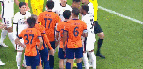 比赛的第15分钟,蒋光太回传,兰克尔泽禁区内被颜骏凌绊倒,主裁判第一时间判罚点球。兰克尔泽抱着球走向点球点,两队球员互相推搡,海港球员非常不满。
