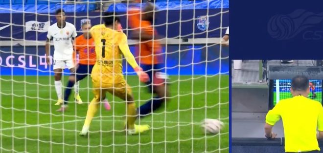 随后,视频助理裁判介入判罚,并且要求主裁判回看慢镜头。从慢镜头来看,在兰克尔泽将球捅走之后,颜骏凌右脚踢在了兰克尔泽的右脚上。