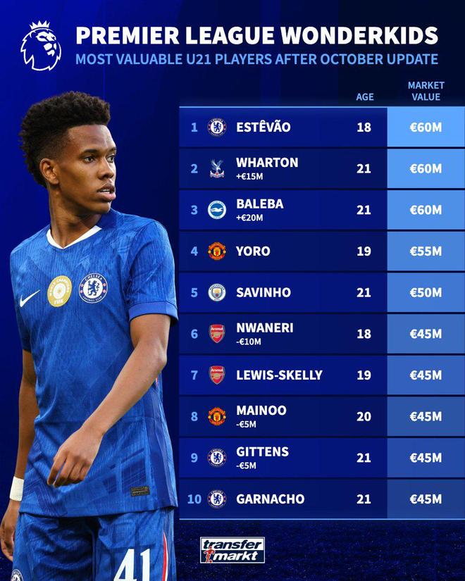 英超球员身价后,德国转会市场网站列出了U21球员身价榜,埃斯特旺、沃顿和巴莱巴以6000万欧居首。