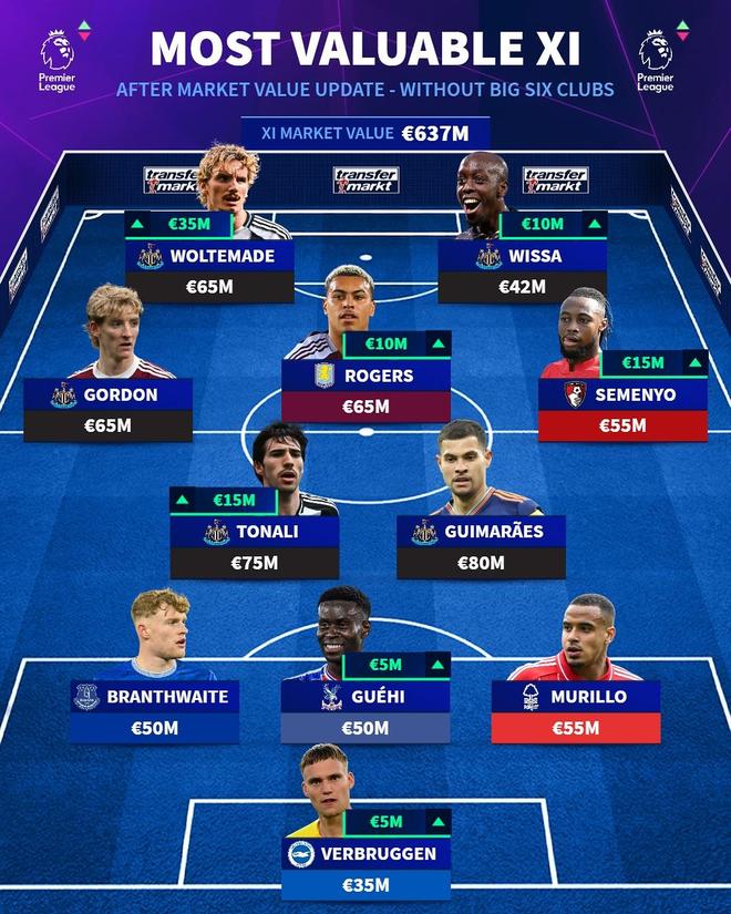 德转列英超非BIG6最贵阵容门将:费布鲁亨(布莱顿,3500万欧)后卫:布兰斯韦特(埃弗顿,5000万欧)、格伊(水晶宫,5000万欧)、穆里略(诺丁汉森林,5500万欧)中场:托纳利(纽卡,7500万欧)、吉马良斯(纽卡,8000万欧)、摩根-罗杰斯(维拉,6500万欧)前锋:安东尼-戈登(纽卡,6500万欧)、沃尔特马德(纽卡,6500万欧)、维萨(纽卡,4200万欧)、塞门约(伯恩茅斯,5500万欧)【上咪咕独家看英超】