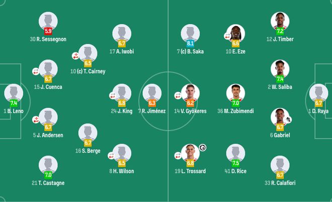 【出场阵容】阿森纳首发:1-拉亚、12-廷伯、2-萨利巴、6-加布里埃尔、33-卡拉菲奥里、10-埃泽(62'23-梅里诺)、36-苏维门迪、41-赖斯、7-萨卡、14-哲凯赖什(96'16-诺尔高)、19-特罗萨德(81'11-马丁内利)替补未出场:13-凯帕、49-斯凯利、3-莫斯克拉、4-本-怀特、22-恩瓦内里、56-道曼富勒姆首发:1-莱诺、21-卡斯塔涅、5-安诺森(42'31-迪奥普)、15-昆卡(82'3-巴锡)、30-塞塞尼翁、16-博格、10-凯尔尼(63'22-凯文)、8-哈里-威尔逊(82'11-阿达玛·特劳雷)、24-乔希-金(63'32-史密斯-罗)、17-伊沃比、7-劳尔·希门尼斯替补未出场:23-勒孔特、2-泰特、6-哈里森·里德、18-阿萨雷