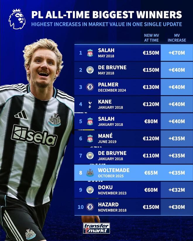 英超球员的历史单次身价涨幅榜,其中沃尔特马德以3500万欧元位居第8,萨拉赫仍然居首。