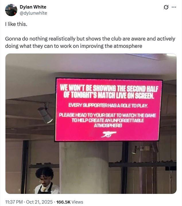 在对阵马竞的欧冠比赛中,酋长球场大厅内的电视上并没有播放下半场的比赛。屏幕上显示了一条提示信息:“我们不会在电视上直播今晚的下半场比赛。每位球迷都有自己的角色,请回到座位上观看比赛,助力营造令人难忘的赛场氛围。”这项大胆举措最终收效显著,阿尔特塔率领的球队以4-0的比分大胜马德里竞技。【上咪咕独家看