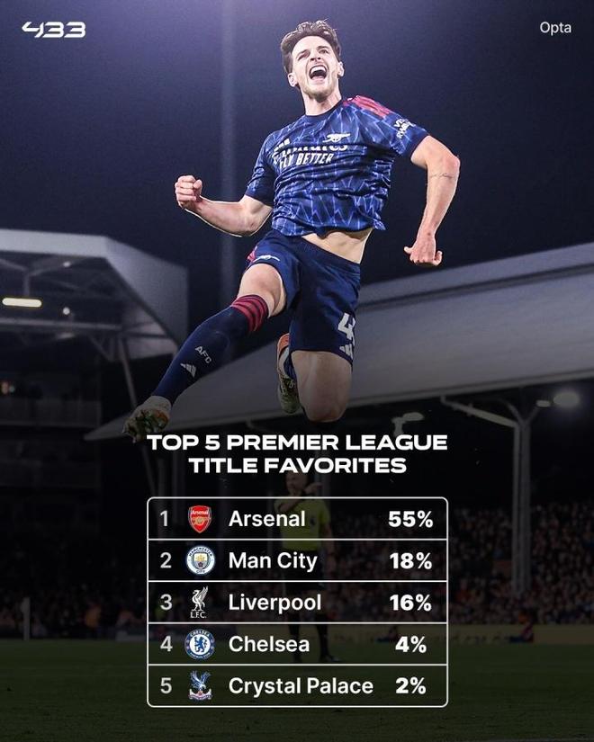 英超夺冠概率方面,曼城以 18% 位居第二,利物浦则以 16% 排在第三,阿森纳的领先优势显而易见。