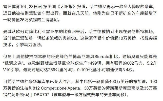 20. 相较于梅西、C罗等前辈更偏向经典奢华的品牌取向,哈兰德的收藏明显聚焦于“小众高性能路线”,例如最新加入的兰博基尼越野超跑,不仅具备极强的稀缺性,还能真正投入实际使用场景。21. 作为新生代球星的代表人物,他所追求的是个性表达与硬核实力的双重满足。有趣的是,他的购车逻辑也折射出当下年轻一代富豪的主流消费理念:不盲目追逐价格标签,但必须拥有独一无二的身份标识。22. 下一次当他驾车出现在公众视野时,球迷们或许不再只关注比赛数据,反而会好奇猜测:“哈兰德的车库,下一匹黑马会是谁?”