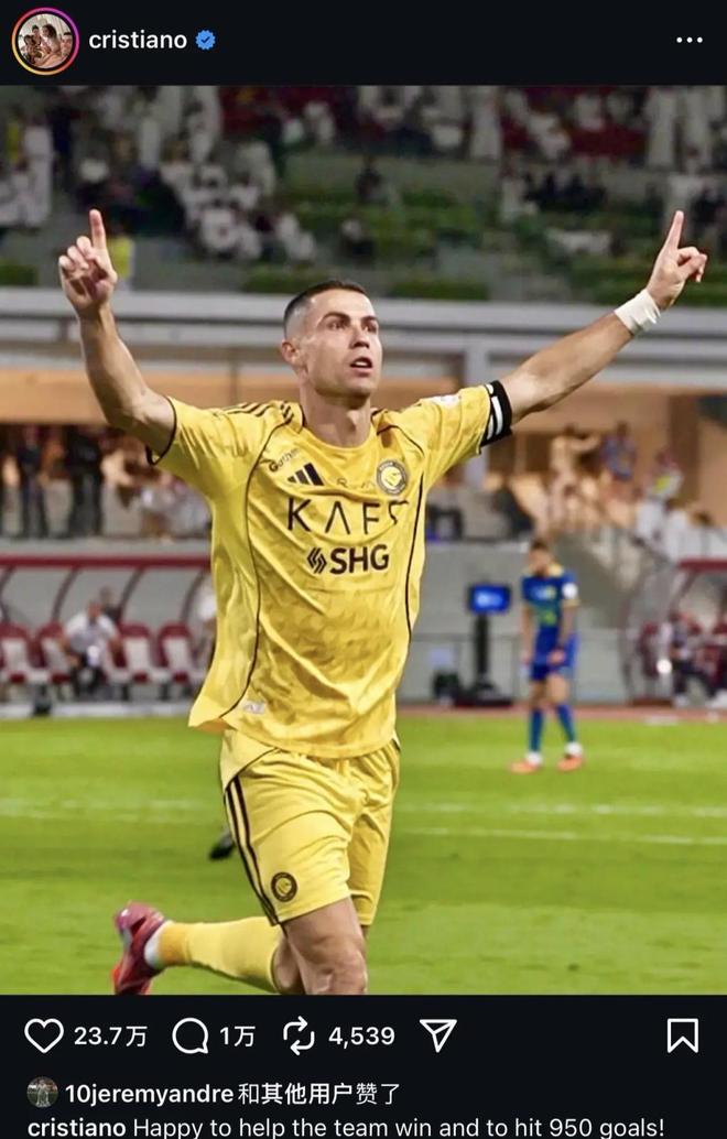 赛后C罗通过社交媒体表示:“很高兴能够帮助球队赢球,并且打进第950球!永远渴望更多。”数据统计显示,C罗完成950球这个里程碑用了1293场比赛。尽管已经40岁高龄,但C罗本赛季的状态相当出色,至今为止他为利雅得胜利出场8次,打入6球并有2次助攻。积分榜上,利雅得胜利也以6连胜领跑。