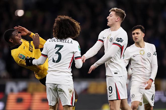 切尔西排出4231阵型。泰里克-乔治顶在最前面。吉腾斯、博纳诺特和埃斯特旺的进攻组合联袂出击。桑托斯和拉维亚组成双后腰。哈托、阿达拉比奥尤、阿昌庞和古斯托4后卫首发出战。菲利普-约恩森担任首发门将。若昂-佩德罗、恩佐-费尔南德斯、凯塞多和里斯-詹姆斯坐在替补席待命。 切尔西在开场第5分钟就进球了。桑托斯远射破门首开纪录。随后,乔治门前包抄推射空门得手。埃斯特旺在第41分钟挑射破门扩大比分。半场切尔西就3球领先。但是,狼队并没有放弃,在下半场踢出了犀利的进攻。阿罗科达雷推射破门扳回一球。第73分钟沃尔费凌空射门打进。随后,德拉普犯规被罚下。第89分钟吉腾斯进球再次拉开差距。虽然最后时刻沃尔费进球缩小差距。但时间所剩无几,狼队没能再进球。最终的比分定格为4-3,切尔西淘汰狼队。