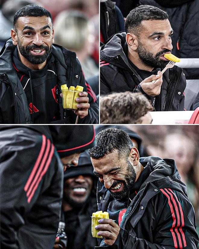 神态轻松,对水晶宫比赛未进入大名单的萨拉赫被拍到在场边吃菠萝