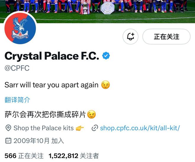 雷速体育10月31日讯 在联赛杯3-0击败利物浦后,水晶宫俱乐部官方社媒修改简介,再次调侃了对手。本场比赛,萨尔完成梅开二度,最终帮助水晶宫3-0完胜。赛后,水晶宫官方社媒将简介修改为了“萨尔会再次将你们撕成碎片”。