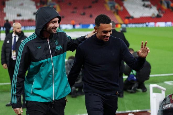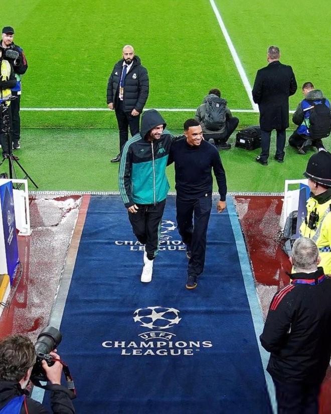 现年27岁的阿诺德出生于利物浦,6岁时便加入利物浦俱乐部,一路从青训梯队晋升至一线队,在为利物浦一线队出战了354场比赛后,这位英格兰后卫在今年夏天转投皇家马德里。如今,阿诺德代表皇马重返安菲尔德,进入替补席,赛前,阿诺德和前队友索博斯洛伊重聚,两人肩并肩,面带微笑。