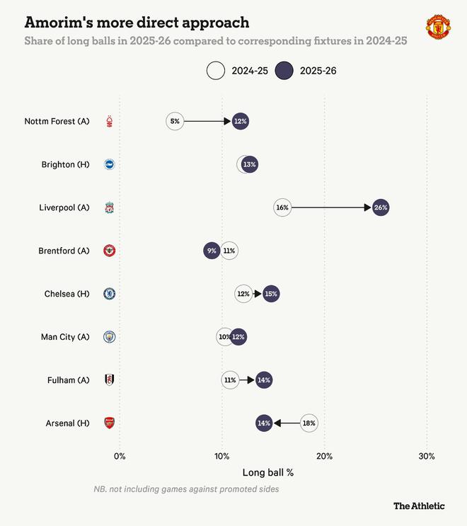 如果观察本赛季球队长传球的百分比,并与2024-25赛季相应的比赛数据相比,几乎每场比赛都有所提升。无论在老特拉福德主场还是客场作战,这种打法也始终如一。在2-2 战平森林后,阿莫林表示他认为球队在主场的活力更足。但这种提升的锐利度并没有让他的球队在主场刻意追求更多控球权。曼联球迷以前不是见过这种打法吗?在某种程度上,是的。穆里尼奥、索尔斯克亚和滕哈格都曾通过专注于转换进攻在曼联取得过一些成功。后者甚至在2023-24赛季前宣称,他打算将俱乐部变成“世界上最好的转换进攻球队”。阿莫林很可能基于与其前任们相似的原因得出这一结论:1. 这种打法适合队中大多数核心球员的特点。2. 事实证明,这种打法在对阵曼城、利物浦等强队时有效。3. 这种风格让人回想起俱乐部此前的黄金时代,也能让球迷看得过瘾。而这些前任教练们在破解深度防守时不是都遇到过问题吗?不幸的是,确实如此。这三人都曾尝试整合高价引进的球员,以期让他们的曼联队在面对深度防守时拥有额外优势。三人所构建的球队通常擅长快速进攻并冲击防线身后的空间,但在对付那些收缩防守、不允许这种空间存在的球队时,则显得办法不多。正如我们此前解释过的,这是阿莫林早在执教他的首场英超比赛之前就长期意识到的问题。终会有一个时刻,他的球队需要学会如何掌控球权并击败那些试图消耗他们耐心的球队。本赛季他已经多次解释,他的球队不应总是追求快速出球。在1-1战平富勒姆后,他说:“当我们进球后,我们就忘记了应该保持的比赛方式。”“我们满脑子只想着保住比分。我们太想赢了,以至于忘了要保持控球权,试着把对手压得更深。我们就这样把一部分比赛主动权交给了富勒姆。”对阿莫林来说,快速不等于愚蠢,迅捷绝不能沦为草率。在整个比赛过程中,必须对球进行积极、有意图的利用。在整个赛季中,保持适当的防守结构将是这种风格的关键。曼联在长传进攻时表现不错,但在防守长传时也显得脆弱(这是阿莫林上任前就长期存在的另一个问题)。接下来可能发生什么?曼联会先改进A计划——即直接打法——然后最终引入B计划:学会有效掌控球权。阿莫林的曼联在本赛季剩余时间里很可能是一支体面的球队。他们正在进步,同时他们的夏季新援也正很好地适应老特拉福德的生活。曼联目前以四场不败保持着联赛第二长的不败纪录,并且他们的赛程安排应该能让他们以稳定的速率继续拿分。利桑德罗-马丁内斯恢复全面健康也将帮助曼联赢得比赛,并让他们在拥有更多控球权时感到更舒适。这位阿根廷中后卫是一名凶悍的抢断者和出色的后场推进传球手,能为球队提供更多控制比赛和丰富打法的手段。“寻找可用空当,并在可能的地方争取人数优势”这种方法——在某种程度上——对阿莫林的前任们起过作用。如果本赛季被视为重建的第一部分,那么使用球员们熟悉且过去曾取得成功的方法是有其价值的。前方还将有更多的挑战——尤其是在下个月姆伯莫、阿马德和马兹拉维分别离队参加非洲国家杯期间——但曼联正越来越接近发挥出他们阵容纸面实力的水平。赢球的方式不止一种。阿莫林有充分的理由避免为了传球而传球。【上咪咕独家看英超】