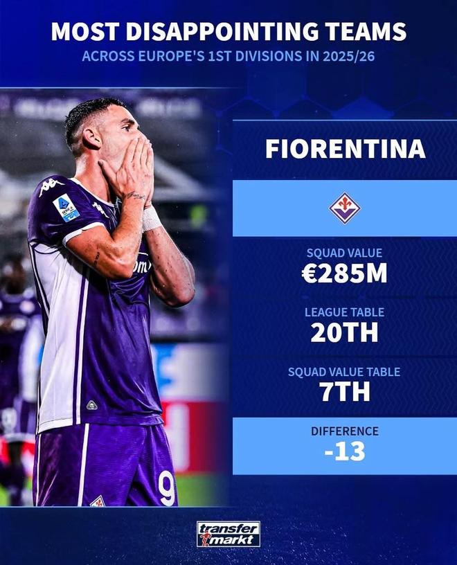 德转盘点本赛季至今最令人失望球队:佛罗伦萨总身价:2.85亿欧元身价意甲第7位,积分意甲第20位,相差13位诺丁汉森林总身价:6.45亿欧元身价英超第8位,积分英超第19位,相差11位赫罗纳总身价:1.55亿欧元身价西甲第9位,积分西甲第20位,相差11位瓦伦西亚总身价:1.67亿欧元身价西甲第8位,积分西甲第18位,相差10位安特卫普总身价:5040万欧元身价比甲第6位,积分比甲第15位,相差9位纽卡斯尔联总身价:7.52亿欧元身价英超第6位,积分英超第13位,相差7位毕尔巴鄂竞技总身价:3.70亿欧元身价西甲第4位,积分西甲第11位,相差7位美因茨总身价:1.58亿欧元身价德甲第11位,积分德甲第17位,相差6位【上咪咕独家看英超】