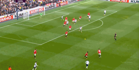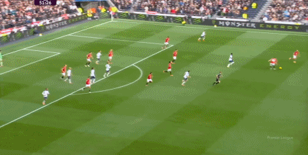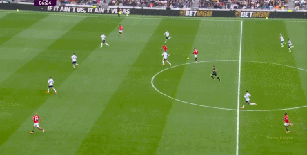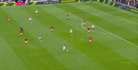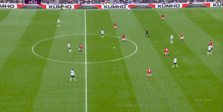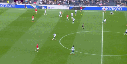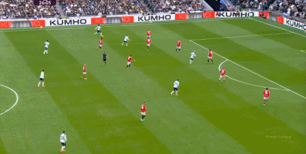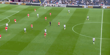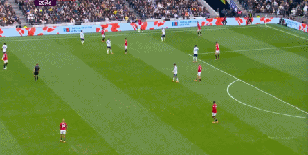 这个时候,当你再回想两次传中时的约罗的站位问题的时候,是不是就显得尤为重要了?足球比赛就是这样的:你在每一个区域,每一个位置上的每一个球员,所做的每一个动作的质量高低,都可能会在90分钟的时间长度和对手输出的强度变化下,成为下一个关键节点的导火索。所谓的教练们关注细节,其实就是在关注这些细枝末节的地方。但是,作为一支无论教练怎么看菜下饭,就像今天客场面对热刺,开局就摆出五后卫,随后在比赛当中或主动,或被动地换下两个后卫的球队,却能在比赛最后10分钟里连丢两球,你觉得这是一支可以实质上改善防守质量的球队吗?在我们看来,这是不能的,你只能带着这个11场丢18球的防守端进行比赛,所以真正能解决问题的,还是在向前的方向上。这个时候,阿莫林在开局的进攻端布置就显得尤为重要了。库尼亚代打中锋,在赛季初的单场比赛有效,是因为当时首发的左边锋是芒特,可以用逆足提供一条斜向的线路,从而和另一侧的逆足进攻端互相联系。然而,今天库尼亚代打中锋,姆贝乌莫顺足打在左侧,他自己可以凭借身体和速度稍有发挥,可是库尼亚呢?