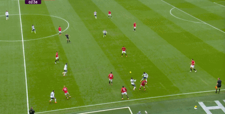 尤其是后者,上赛季的强强对话和欧联杯决赛,其实是说明了阿玛德-迪亚洛作为年轻球员,还担当不了右边锋的职责。在身侧有姆贝乌莫这个支撑点的情况下,他就可以成为一个不错的进攻型右翼卫。哪怕这两个人同时摆在右侧,在阵地战存在线路重叠的问题,但在转换阶段,尤其是姆贝乌莫回撤支撑,阿玛德-迪亚洛从身旁穿插的时候,就可以形成清晰的进攻效果。到了这场,身侧没有了大哥来带,在这次越位进攻当中从弱侧包抄都给忘了:
