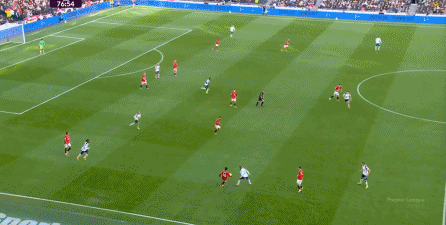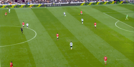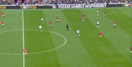 这就是年轻球员在大哥身边成长的过程,但对于曼联来说,你有反制能力,你才能打疼、打怕对手,对手向前投入进攻就会出现犹豫,这就是一个帮助防守端解压的方法。而且,在11轮比赛之后,曼联恰恰愈发呈现出重视转换的样子,因为在曼联11场进19球,射门数、射正数都位居前列,是联赛进球第四多的球队的情况下,曼联是本赛季英超第一支丢失球权次数超过1500次的球队。以1510次丢失球权,在这项数据上排名榜首。不仅如此,11轮比赛过后,曼联的传球数表现尚可,以4784次传球排名联赛第7,但传球成功率只有79%,排名联赛第12。这是因为曼联的长传次数很多,以644次排名联赛第2。所以当你将这些数据汇总起来一起关注,得出的结论就非常清晰了:在阿莫林的治下,曼联是一支清晰的转换型球队。用大家更容易理解的方法来说,那就是你可以说曼联没防守,但确实是一支很会反击的球队。这再次指向了阿莫林的战术思想,确实没有滕哈赫那般激进,因为后者绝对无法容忍球权不在自己的脚下,但对于阿莫林来说,这一点倒没什么。拉门斯的大脚一脚接一脚,球队已经相当习惯了。但是,在这种战术思想和现在的表现当中,曼联的问题也会因此加剧,那就是由于丢失球权次数太多,所以曼联在比赛中和对手之间形成的回合数太多,这一点是需要解决的,因为解决了回合数,球队,尤其是中后场的消耗就可以得到控制。防守质量,就有机会因此稍有提高。一个很清晰的解决方法就是提高自己的控球率,但由于曼联自己的技术能力有限,提高了控球率不仅会导致打转换的机会变少,还可能会出现抓不住打转换的机会的问题,更不用说可能会因此大幅暴露后场的空间。这显然不是阿莫林的战术思路,但在相对保守和中庸的流派当中,依然有办法,那就是控制住比赛的节奏:我想快的时候,就能快起来,而我不想快的时候,也可以让比赛慢下来。当然了,这一点也在很大程度上取决于曼联的中后场的防守意识,能否在7人,甚至6人防守当中,抵住对手最有威胁的第一波进攻,从而给中前场球员回来落位的时间。但还是那句话,曼联在这一点上是不能指望的,所以关键在于其他环节。虽然曼联在进攻端的布置在理论上稍有问题,库尼亚和阿玛德-迪亚洛在各自位置上的表现不足很清晰,导致上半场的反制能力没能拔到理论上的最高值,但曼联还是先进一球,而且线路上恰好是右路的阿玛德-迪亚洛传给左路的姆贝乌莫: