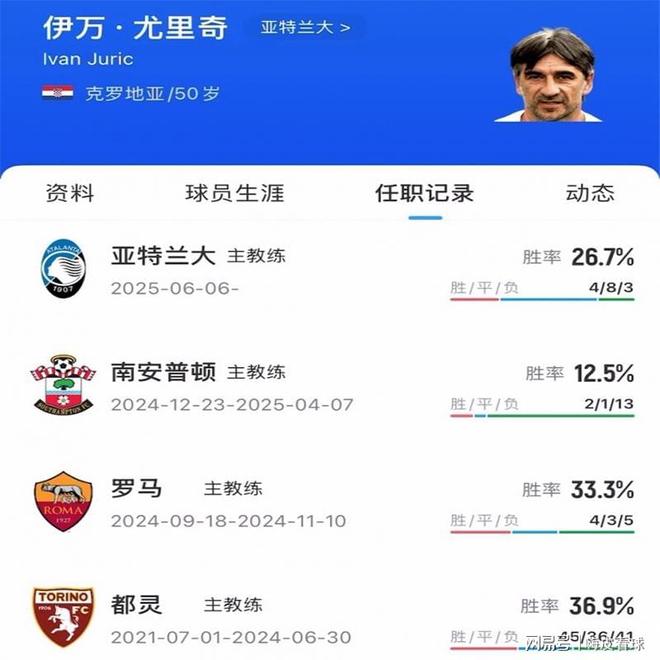 亚特兰大在欧冠的排名,当然不算太差,联赛告别不败后,连续失利,才是压倒在尤里奇身上的最后一根稻草。有趣的是,去年的这个时候,尤里奇被罗马解雇,几个月前,尤里奇被南安普顿解雇,刚好整整一年,面对三次遭遇下课的结局,球迷戏称,尤里奇一直在“混日子”,同时也让人想起另外一个叫做伊万的主教练,他是不是也在混日子呢?去年9月,罗马解雇了德罗西,迎接尤里奇的到来,不到两个月,罗马又宣布换帅,尤里奇在短短的53天执教过程中,仅获得4胜3平5负的成绩,胜率刚好只有三分之一。随后,著名的“救火老帅”拉涅利重新出山,带领罗马长期保持不败,最终获得意甲第5名,以1分之差落后尤文图斯,无缘欧冠。