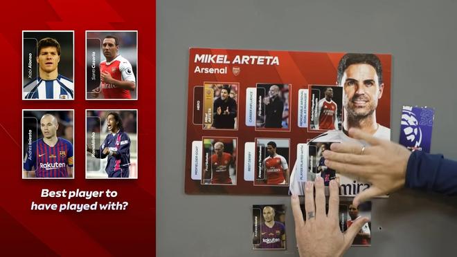 米克尔,欢迎来到贴纸册挑战。你面前有一张属于你自己的贴纸页,上面写着你作为球员和教练生涯里的几个重大问题。你需要做的,就是从每一组选项里挑出你最喜欢的一项,贴在板子上。听起来可以吗?准备好了吗?准备好了。今天这期节目里,米克尔会选择他职业生涯中影响最大的人、他执教阿森纳期间最难忘的一个进球、他心中英超最强的中场、他认为最精彩的德比,以及他踢球时期遇到的最强队友。那我们就从第一个类别开始。首先是“职业影响力”。在你的职业生涯里,你接触并共事过很多优秀的人。我们想知道,到今天为止,谁对你的影响最大。