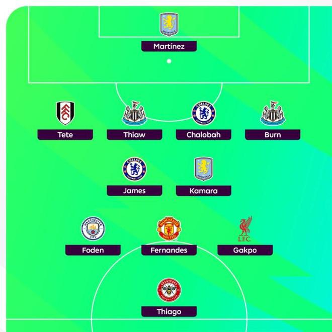 第13轮最佳阵容门将:达米安-马丁内斯(维拉)后卫:泰特(富勒姆)、佳夫(纽卡)、查洛巴(切尔西、丹-伯恩(纽卡)中场:里斯-詹姆斯(切尔西)、卡马拉(维拉)、布鲁诺-费尔南德斯(曼联)前锋:福登(曼城)、伊戈尔-蒂亚戈(布伦特福德)、加克波(利物浦)主帅:马雷斯卡(切尔西)【上咪咕独家看