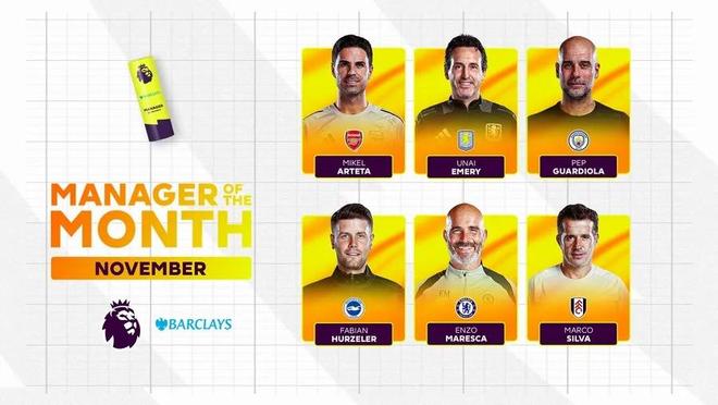 官方公布了11月最佳主教练候选名单,马雷斯卡、瓜迪奥拉、阿尔特塔、埃梅里等人在列。