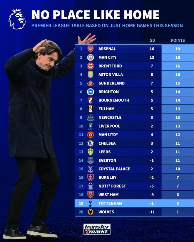 本赛季英超主场战绩榜1、阿森纳 19分2、曼城 18分3、布伦特福德 16分4、维拉 16分5、桑德兰 15分6、布莱顿 14分7、伯恩茅斯 14分8、富勒姆 13分9、纽卡 13分10、利物浦 13分11、曼联 12分12、切尔西 11分13、利兹联 11分14、埃弗顿 11分15、水晶宫 10分16、伯恩利 7分17、诺丁汉森林 7分18、西汉姆 6分19、热刺 5分20、狼队 1分【上咪咕独家看英超】