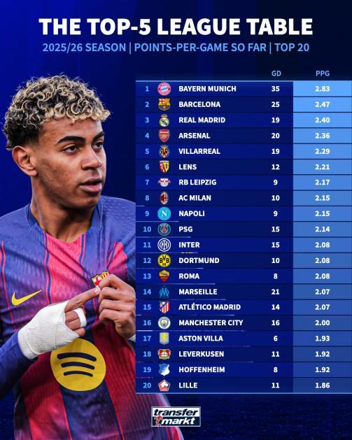 本赛季至今五大联赛场均积分TOP20:1. 拜仁慕尼黑 2.83分 净胜球+352. 巴塞罗那 2.47分 净胜球+253. 皇家马德里 2.40分 净胜球+194. 阿森纳 2.36分 净胜球+205. 比利亚雷亚尔 2.29分 净胜球+196. 朗斯 2.21分 净胜球+127. RB莱比锡 2.17分 净胜球+98. AC米兰 2.15分 净胜球+109. 那不勒斯 2.15分 净胜球+910. 巴黎圣日耳曼 2.14分 净胜球+1511. 国际米兰 2.08分 净胜球+1512. 多特蒙德 2.08分 净胜球+1013. 罗马 2.08分 净胜球+814. 马赛 2.07分 净胜球+2115. 马德里竞技 2.07分 净胜球+1416. 曼城 2.00分 净胜球+1617. 阿斯顿维拉 1.93分 净胜球+618. 勒沃库森 1.92分 净胜球+1119. 霍芬海姆 1.92分 净胜球+820. 里尔 1.86分 净胜球+11【上咪咕独家看英超】