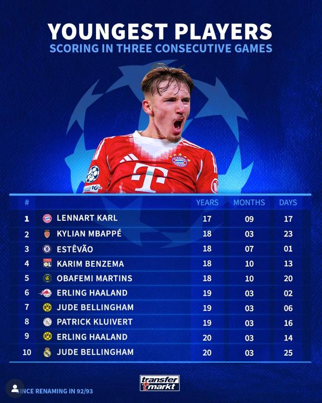 北京时间12月10日,拜仁慕尼黑的17岁小将伦纳特-卡尔达成了连续三场欧冠进球的成就,帮助拜仁在欧冠联赛阶段第6轮的比赛中主场3-1逆转战胜葡萄牙体育。赛后Opta统计出了自1992-93赛季欧冠改制以来连续三场进球最年轻的10名球员,伦纳特-卡尔超越姆巴佩排名第一。92年欧冠改制后连续三场进球最年轻球员TOP10:1. 伦纳特-卡尔(拜仁慕尼黑) 17岁9个月17天2. 姆巴佩(摩纳哥) 18岁3个月23天3. 埃斯特旺(切尔西) 18岁7个月1天4. 本泽马(里昂) 18岁10个月13天5. 马丁斯(国际米兰) 18岁10个月20天6. 哈兰德(萨尔茨堡红牛) 19岁3个月2天7. 贝林厄姆(多特蒙德) 19岁3个月6天8. 克鲁伊维特(阿贾克斯) 19岁3个月16天9. 哈兰德(多特蒙德) 20岁3个月14天10. 贝林厄姆(皇家马德里) 20岁3个月25天【上咪咕独家看英超