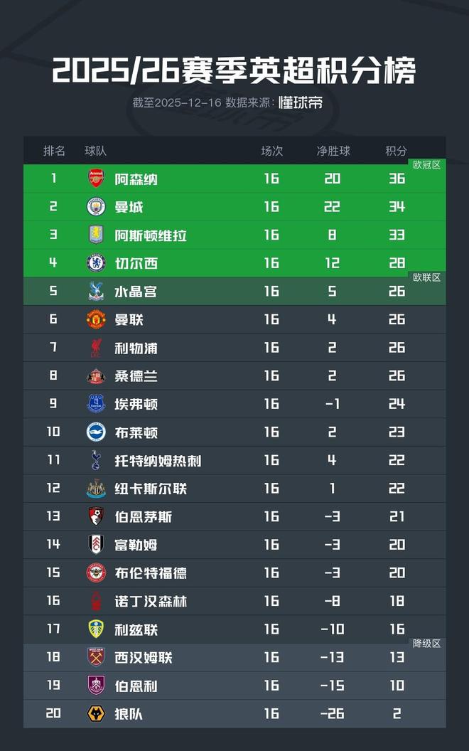位列前三的阿森纳、曼城和阿斯顿维拉在本轮均击败各自对手,这使得他们之间的分差没有产生变化,而切尔西则成功反超完败于曼城的水晶宫升至第4。水晶宫、曼联、利物浦和桑德兰四支球队的积分都是26分,这使得他们只凭净胜球的差距分列第5至第8位。24分的埃弗顿和23分的布莱顿依次位列第9和第10,一同遭遇失利的托特纳姆热刺和纽卡斯尔联同积22分排在第11和第12。刚刚和曼联经历进球大战最终打成平手的伯恩茅斯以21分排名第13,同样是20分的富勒姆和布伦特福德则只是因为进球数的差距分列第14和第15位。完胜热刺的诺丁汉森林以18分位列第16位,而16分的利兹联则是以领先降级区3分的优势排在第17位。被维拉逆转的西汉姆联继续积13分排名第18,七连败的伯恩利和九连败的狼队则继续位列积分榜的最后两位。【上咪咕独家看英超】