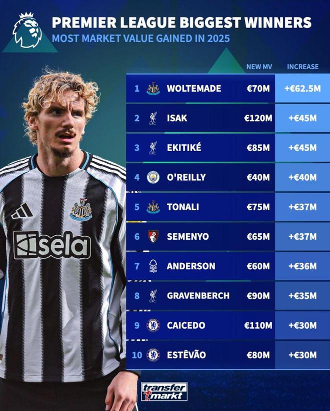 德转英超球员2025年身价涨幅TOP10:1. 沃尔特马德(纽卡斯尔联) +6250万欧元 7000万欧元2. 伊萨克(利物浦) +4500万欧元 1.2亿欧元3. 埃基蒂克(利物浦) +4500万欧元 8500万欧元4. 尼科-奥赖利(曼城) +4000万欧元 4000万欧元5. 托纳利(纽卡斯尔联) +3700万欧元 7500万欧元6. 塞门约(伯恩茅斯) +3700万欧元 6500万欧元7. 埃利奥特-安德森(诺丁汉森林) +3600万欧元 6000万欧元8. 赫拉芬贝赫(利物浦) +3500万欧元 9000万欧元9. 莫伊塞斯-凯塞多(切尔西) +3000万欧元 1.1亿欧元10. 埃斯特旺(切尔西) +3000万欧元 8000万欧元【上咪咕独家看英超】