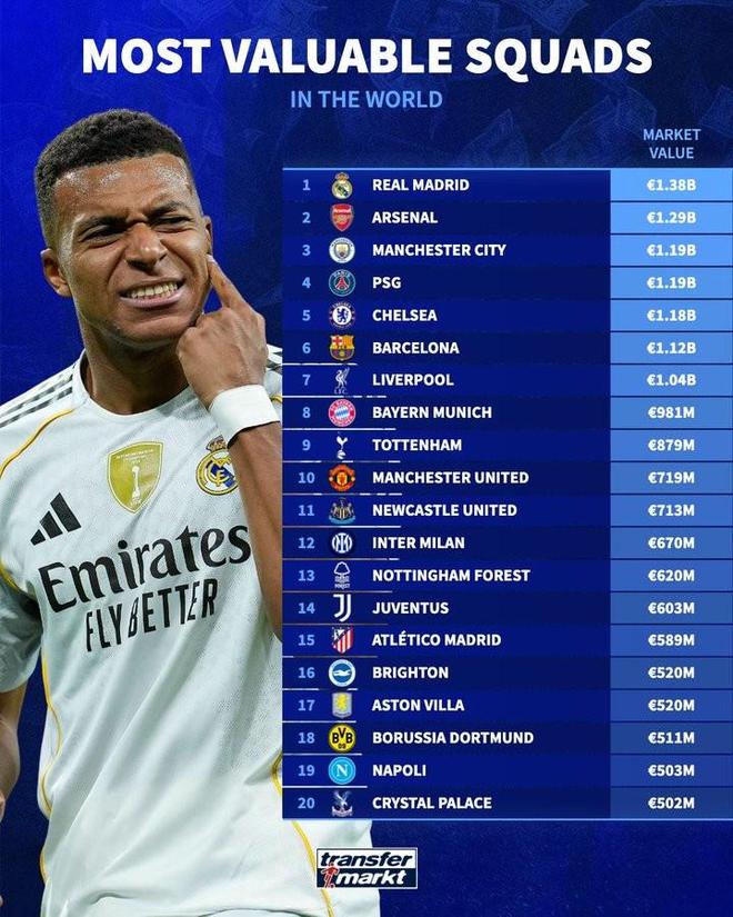 全世界总身价最高球队Top20:1、皇马 13.8亿欧2、阿森纳 12.9亿欧3、曼城 11.9亿欧3、巴黎 11.9亿欧5、切尔西 11.8亿欧6、巴萨 11.2亿欧7、利物浦 10.4亿欧8、拜仁 9.81亿欧9、热刺 8.79亿欧10、曼联 7.19亿欧11、纽卡 7.13亿欧12、国米 6.7亿欧13、诺丁汉森林 6.2亿欧14、尤文 6.03亿欧15、马竞 5.89亿欧16、布莱顿 5.2亿欧16、维拉 5.2亿欧18、多特 5.11亿欧19、那不勒斯 5.03亿欧20、水晶宫 5.02亿欧【上咪咕独家看英超】