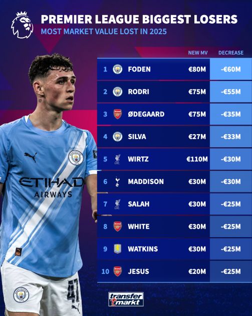 英超球员2025年身价跌幅榜:1、福登(曼城) 身价下降6000万2、罗德里(曼城)身价下降5500万3、厄德高(阿森纳)身价下降3500万4、席尔瓦(曼城)身价下降3300万5、维尔茨(利物浦)身价下降3000万6、麦迪逊(热刺)身价下降3000万7、萨拉赫(利物浦)身价下降2500万8、怀特(阿森纳)身价下降2500万9、沃特金斯(维拉)身价下降2500万10、热苏斯(阿森纳)身价下降2500万