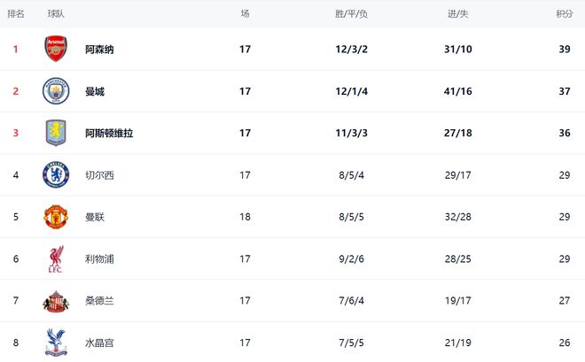 这场比赛让英超争四格局大乱。3大豪门积分相同,切尔西、曼联和利物浦都是29分。切尔西拥有净胜球的优势,排名第4。曼联则升到第5名。利物浦净胜球最少,掉到第6名。不过,曼联比切尔西和利物浦多踢1场,第5的位置并不稳固。