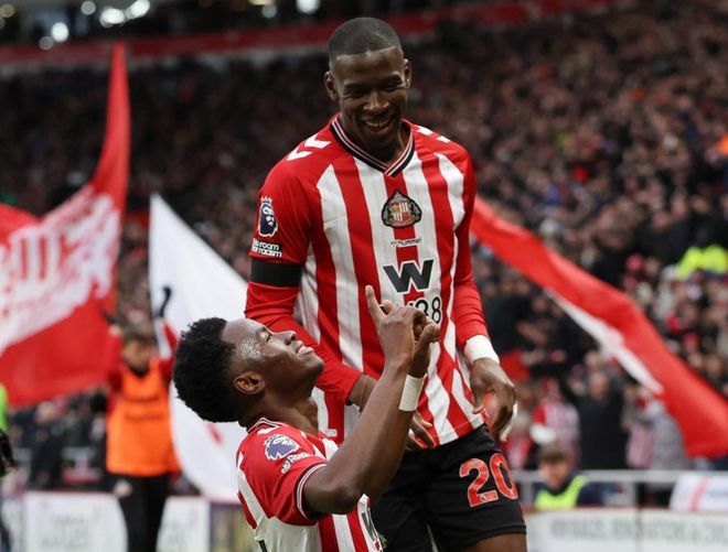桑德兰排出4231阵型。布罗贝伊顶在最前面。克里斯-里格、勒费埃和阿丁格拉的进攻组合联袂出击。扎卡和海特勒伊达组成双后腰。穆杰莱、西尔金、阿尔德雷特和休姆4后卫首发出战。罗埃夫斯担任首发门将。