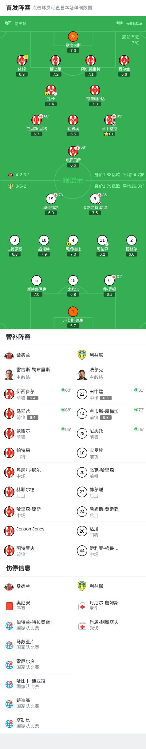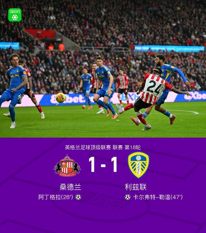 北京时间12月28日英格兰足球顶级联赛 联赛 第18轮,桑德兰主场对阵利兹联。上半场,扎卡助攻阿丁格拉破门。下半场,阿伦森助攻卡尔弗特-勒温扳平。最终比分桑德兰 1-1 战平利兹联。关键事件第28分钟,扎卡斜塞,阿丁格拉兜射破门,桑德兰1-0利兹联