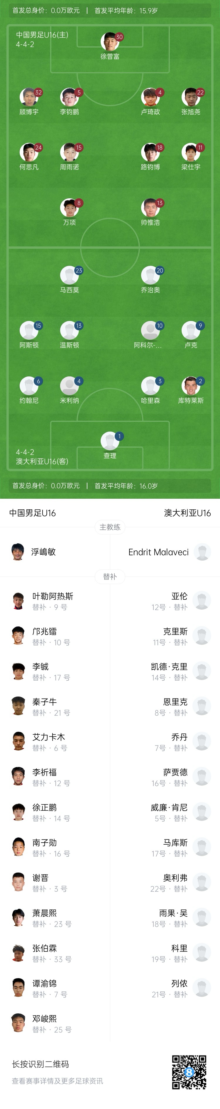 澳大利亚U16首发:1-查理·威尔逊-帕普、2-贝西安-库特莱希、3-哈里森-邦德、4-迈尔斯-米利纳、6-约翰尼-帕夫洛维奇、9-卢克-贝奇诺夫斯基、10-阿科尔-阿孔、13-温斯顿-阿什伯恩、15-阿斯顿-里德、20-乔治奥-哈萨拉蒂、23-马西莫-马罗内