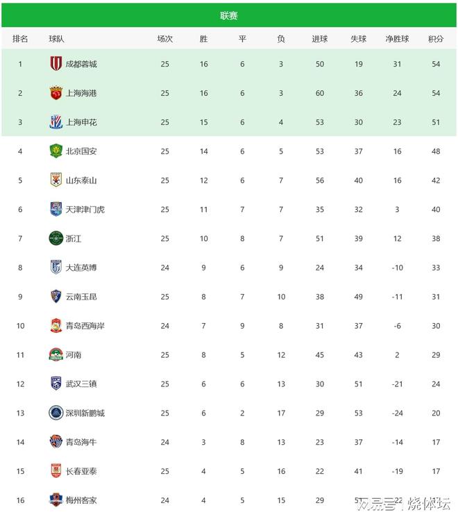 上海申花 1-1 成都蓉城此役上海申花坐镇上海体育场,直到第68分钟终于取得领先,来自于陈晋一的进球。成都蓉城顽强追赶,终于在第90+10分钟扳平比分,周定洋破门建功。双方最终握手言和,上海申花主场被绝平错失3分,目前积51分仍排名第三。成都蓉城极其惊险从上海带走1分,目前仍然排名积分榜榜首,本轮这1分至关重要。第25轮其他战况武汉三镇 2-5 河南队云南玉昆 1-1 大连英博青岛海牛 2-2 山东泰山梅州客家 1-2 青岛西海岸长春亚泰 3-3 浙江队