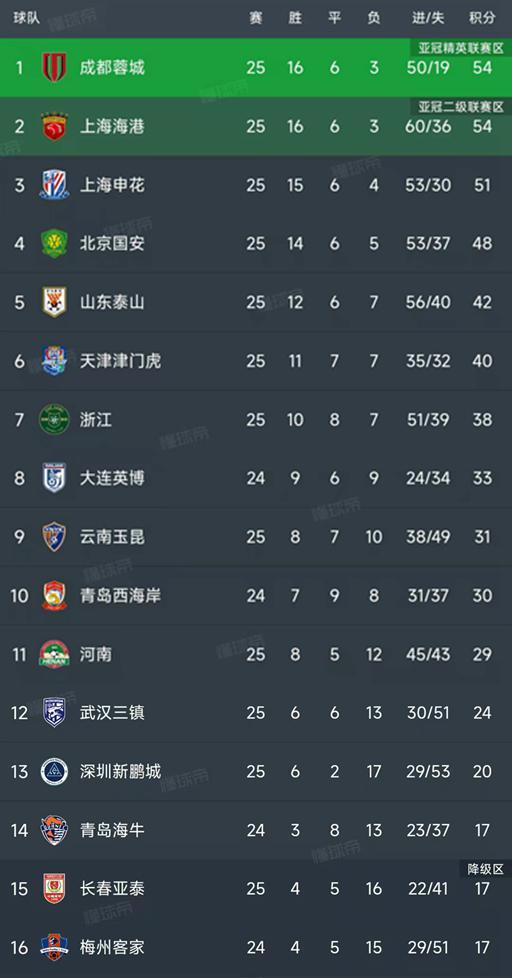 中超最新积分榜本赛季的争冠和保级格局基本确定,我们先看争冠区的战况,成都蓉城和上海海港的积分持平54分,领跑全联盟,谁能获得冠军就看最后5轮的决战!蓉城昨晚客场对阵申花,这是一场双方谁都不想输的关键战役,韦世豪在上半场拉伤提前伤退,主场作战的申花在下半场第68分钟靠着反击由陈晋一兜射打破僵局,随后申花有杀死比赛的机会,但是未能打进第二球。