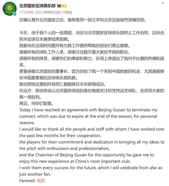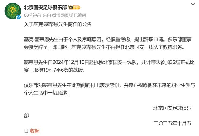 10月5日晚,北京国安官方发布关于主帅基克·塞蒂恩的离任公告。原文如下: 基克·塞蒂恩先生由于个人及家庭原因,经慎重考虑,提出辞职申请。俱乐部董事会接受辞呈,即日起,基克·塞蒂恩先生不再担任北京国安一线队主教练职务。 塞蒂恩先生自2024年12月10日起执教北京国安一线队,共计带队参加32场正式比赛,取得19胜7平6负的战绩。 俱乐部对塞蒂恩先生在此期间的付出表示感谢,并衷心祝愿他在未来的职业生涯与个人生活中一切顺遂!在确认离开北京国安之后,塞蒂恩用一段文字向北京这座城市深情告别: 今天,由于我个人的一些原因,决定与北京国安足球俱乐部终止工作合同,这份合同本应该在本赛季结束到期。 我要向在这段时间里所有为我工作提供帮助的朋友们表达谢意。 感谢所有的球队工作人员,感谢过往数月里大家给予我的配合。 感谢所有的球员,感谢你们的奉献和努力,在场上传递出了我对于比赛的热情和追求。 更要感谢北京国安的董事长,因为你给了我一个来到中国执教的机会,尤其是能够在中国最重要的足球俱乐部执教。 我也预祝这里的所有同仁都能够在未来获得成功。 在远方,我也将会以北京国安球迷的身份继续关注和支持这支球队,去庆祝大家的每一场胜利。 再见,向你们致敬。北京电视台国安跟队记者透露了塞蒂恩下课的幕后原因。该记者表示,对于塞蒂恩,俱乐部管理层其实已经给足了耐心。主场1比3输给申花之后,俱乐部就已经针对暴露出的问题,提出过调整意见。0比6负于泰山之后,从董事长,总经理再到助理教练,都又与塞蒂恩进行了多次沟通,但随之而来的仍是固执和三连败。导致这次下课的真正导火索,是客战麦克阿瑟的阵容以及场上表现出来的一切。赛前,俱乐部明确向塞蒂恩传达了北京国安有着外战必须全力以赴的传统,在得知首发名单后,俱乐部管理层感到吃惊和愤怒。俱乐部管理层至今为止,都看不到实质性解决问题的举措。不仅是俱乐部高层,塞蒂恩的助教团队也曾提出了很多意见,但主教练并没有采纳,因此教练团队的失望情绪越来越重。 如果继续让塞蒂恩执教,俱乐部管理层认为球队难以在足协杯决赛前重回正轨,球员也将失去赢得比赛的自信心从而导致更衣室逐渐失控。管理层认为在足协杯决赛之前的联赛+亚冠,每一场都是非常重要的,球队的信心不能失去,因此必须做出调整主教练的决定。球队目前的首要任务,是重塑信心,重新恢复精神面貌。未来还有四轮联赛,四轮亚冠小组赛,一场足协杯决赛。必须打出水平和精气神,足协杯决赛必须全力争冠。来源:综合北京国安俱乐部、微博、新华社等