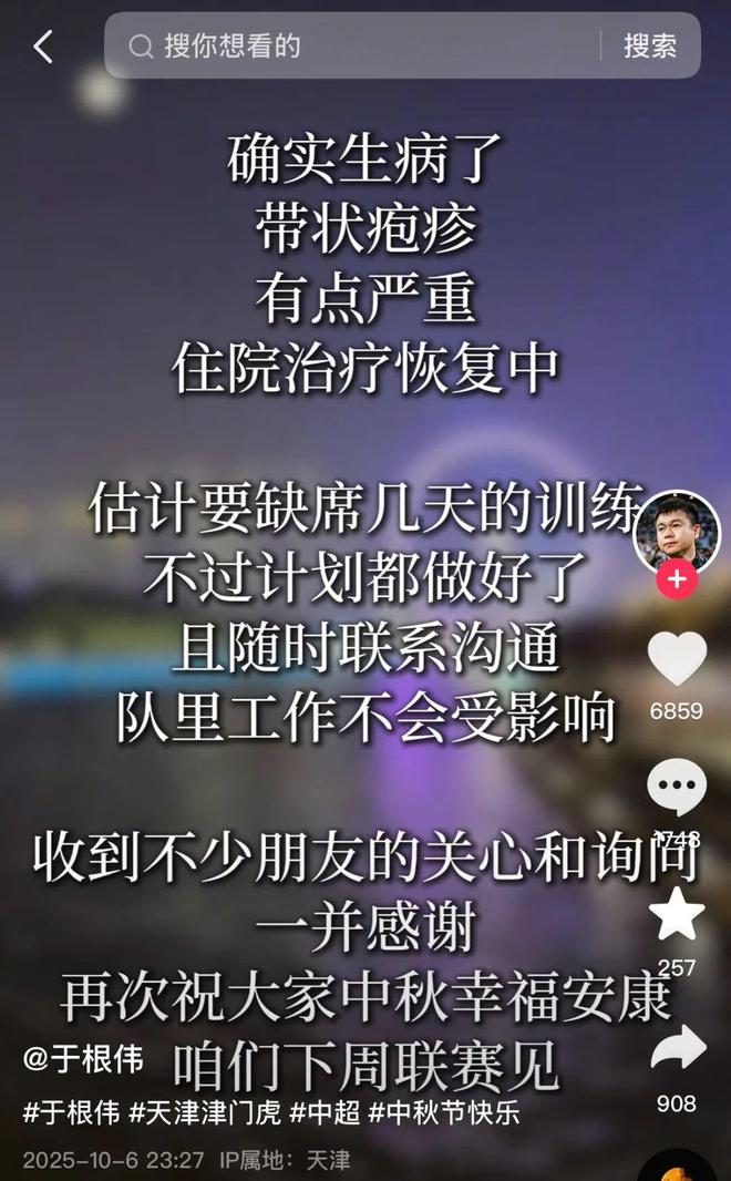 内容转载自:津云6日,天津日报记者顾颖在社交媒体透露,于根伟近来身体抱恙,近一周一直处于每天跑医院输液治疗的状态。对此,于根伟本人昨天深夜在社交媒体回应:确实生病了,带状孢疹,有点严重。住院治疗恢复中。估计要缺席几天的训练,不过计划都做好了,且随时联系沟通,队里工作不会受影响。收到不少朋友的关心和询问,一并感谢。再次祝大家中秋幸福安康,咱们下周联赛见。新闻链接国庆中秋假期即将结束,多数中超球队今天收假开练,备战将于下周末重启的联赛。9月完成一波三连胜后,天津津门虎队也安排在今天集中下午开练,接下来一阶段的3轮比赛,津门虎队将于10月18日客场挑战云南玉昆队,10月25日主场对阵长春亚泰队,11月1日客场挑战山东泰山队。尽力打好这3场比赛,以轻松的状态进入本赛季的最后一个间歇期,备战11月联赛最后一轮的主场收官战,是球队上下的共同心愿。孙铭谦、陈哲宣将暂时缺席津门虎队本阶段的备战。孙铭谦入选中国香港代表队,将于10月9日和14日,随队在亚洲杯预选赛中,两回合对阵孟加拉国队,不过目前孙铭谦膝盖存在一些伤病隐患,预计关于他的使用,球队也会谨慎权衡。陈哲宣则已于昨天到昆明报到,参加为期10天的U22男足国家队集训和热身,这期间两回合对阵泰国队的比赛,陈哲宣能获得多少出场时间,表现如何,受到津门虎教练组的高度关注。津门虎队今天的训练将以恢复、调整为主,主教练于根伟能否出现在训练场,其实也还是未知数。据了解,实际上9月28日主场对阵河南队的比赛,于根伟就已经有恙,抱病在场边指挥比赛,也是因为一直坚持,情况反而更加严重,过去一周多的假期,他一直处于每天跑医院输液治疗的状态,治疗周期到今天还没有结束,不过他本人早些时候也表示,自己会尽量不耽误出勤。