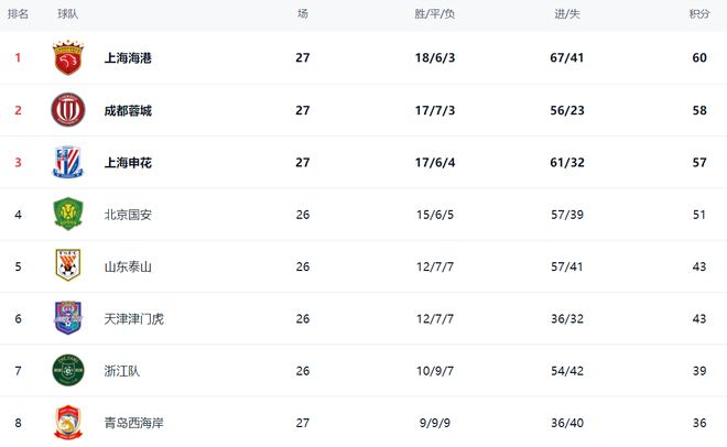 中超这3支强队都赢了,上海海港和上海申花都是逆转获胜,成都蓉城赢得没有那么惊险。冠军的争夺依然十分激烈,前3的球队最大差距 只有3分。上海海港以60分高居榜首,成都蓉城以58分紧随其后,上海申花57分排名第3。第4的北京国安就落后得有点多了,只拿到51分。山东泰山和天津津门虎都是43分,排名第5和第6名。